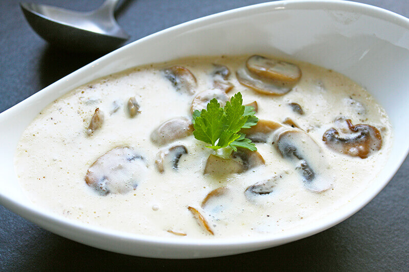 Giet er de melk en bouillon bij en roer tot een gladde saus. Laat de saus 15 minuten zachtjes koken terwijl je af en toe roert.